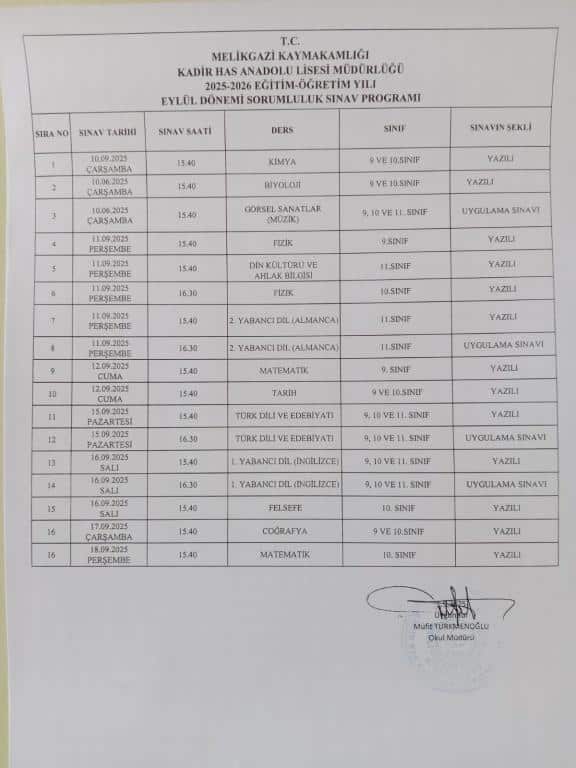 2025-2026 Eğitim-Öğretim Yılı, Kadir Has Anadolu Lisesi, Eylül Dönemi Sorumluluk Sınavı programı açıklandı.